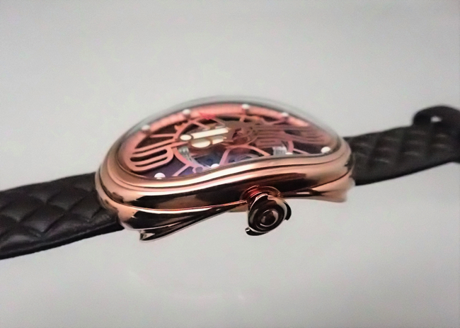 極限まで角をおとしたアーチ型の流線型ケースは大きさを感じさせず、細めの手首回りでもしっかりフィットしてくれます。