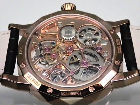 | ムーブメント | 手巻き(28800振動/時、153パーツ、25石)、トゥールビヨン(1分間に1回の回転) |
