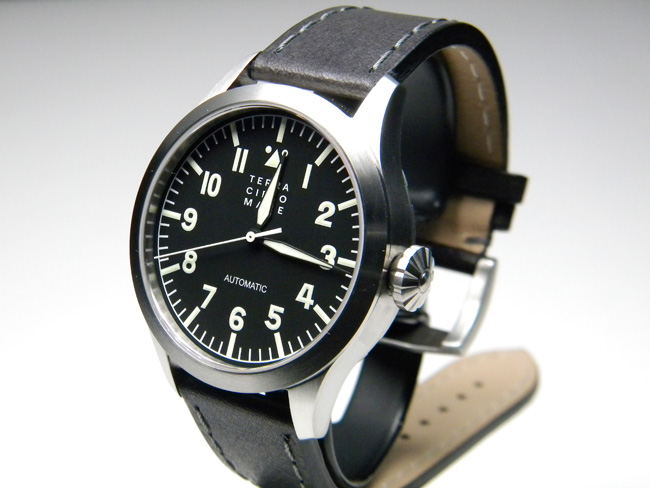 アヴィアトーレ空を意味するCIELO(チエロ)コレクションは大空をかける男たちを讃えるモデルがラインナップ。アヴィアトーレは、1934年、飛行艇における世界最速記録を樹立した水上機テストパイロット「フランチェスコ・アジェッロ」を讃えて作られたモデル。ケースバックにもその時の飛行艇「MC72」のロゴが刻印されている。極太にリーフ針、長めのセンター秒針、毛足の長い分目盛りを備え、また、針・バーインデックス・アラビア数字部分全てにルミノバ加工が施されているため、視認性も抜群。